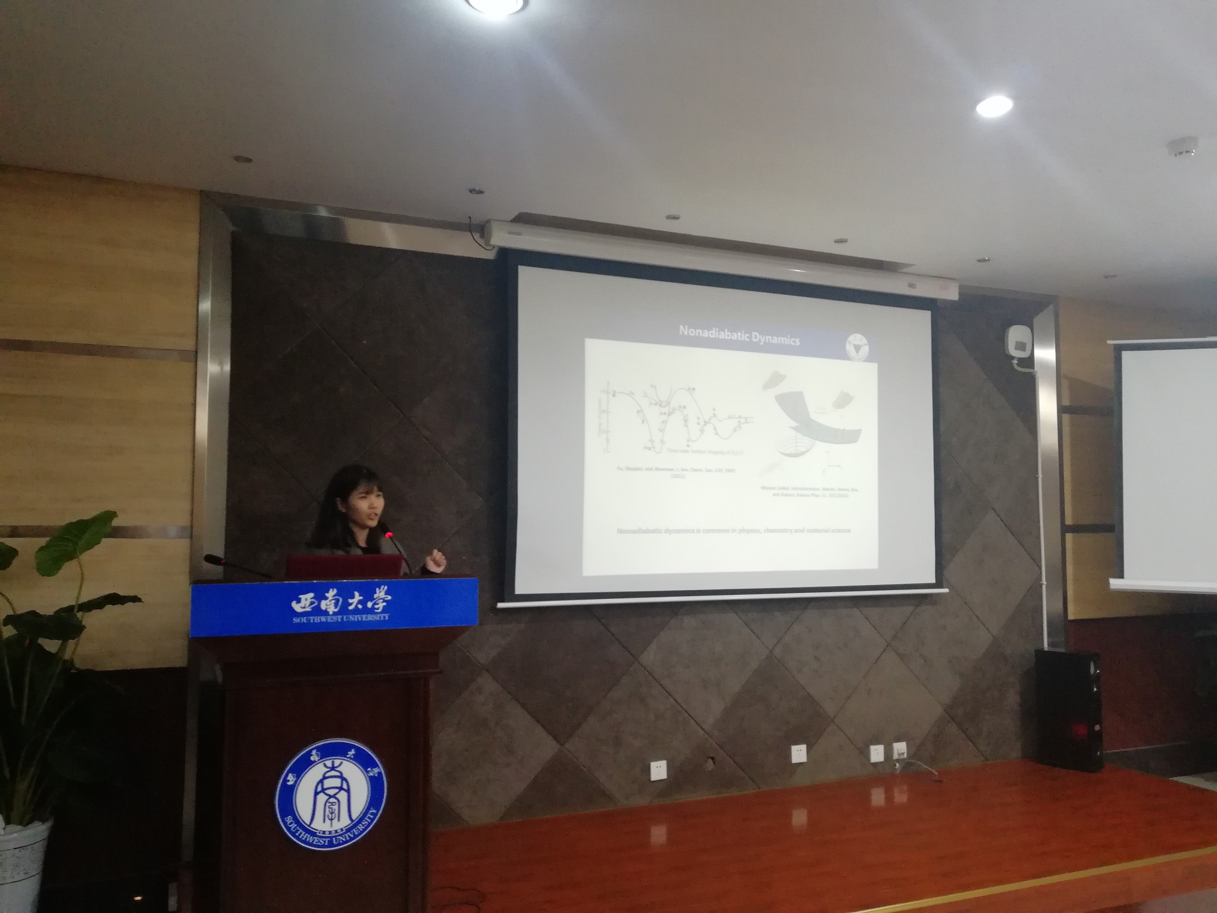 首先做报告在读博士研究生邱静,她分享她的科研故事表面跳跃模拟中的交叉分类与简化。第二个作报告的是硕士孙文博,他的报告关于将深度学习的模型用于有机太阳能电池材料的评估,将极大提高材料的开发效率。紧接着硕士陈文蓝报告关于理论研究亚酞菁存在多种电荷传输状态;硕士王凤起报告关于钛取代锰的建立四种不同钙锰钛氧模型;硕士彭索萍,报告关于边缘取代对Subappc的结构及光学性能的影响;硕士侯循,报告关于a、b、g三种石墨炔的第一性原理计算,以及硕士邱梧珂报告石墨烯缺陷类型对核磁共振参数的影响。