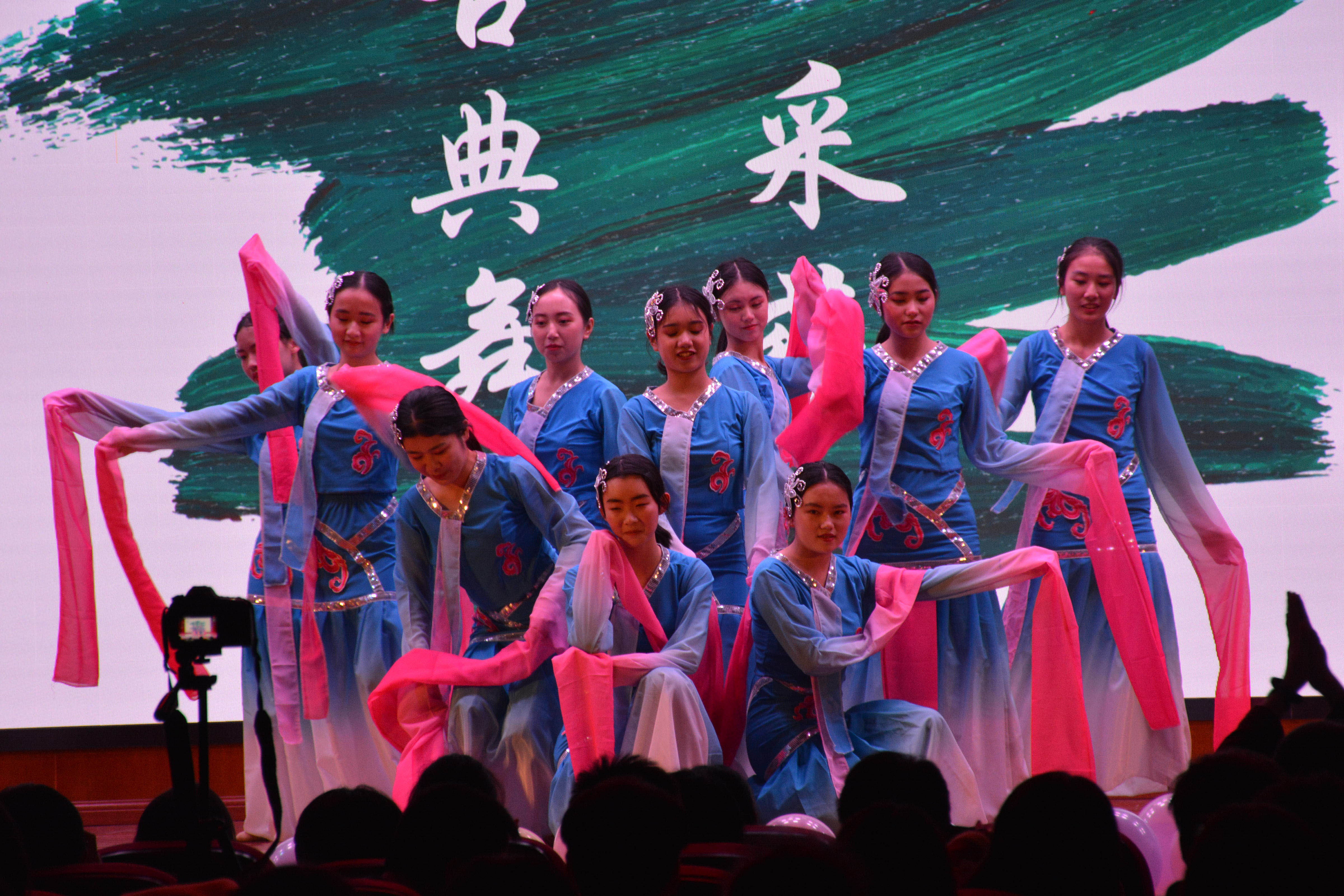 在为国家兴盛的欢呼与喝彩声中,全场气氛达到最高潮,观众挥舞手中的荧光棒,为演员们大声叫好。在员工们的精彩表演后,是老师们为2018级新生精心准备的惊喜。在现场播放的视频中,2018级辅导员刘昭暾老师及各班班主任表达了对新生们的殷切期盼,刘昭暾、谭小东、王姝、金燕子、陶圆昌五位老师的深情朗诵《材情似海 梦展未来》指导同学们如何成“材”圆梦,同学们感受深刻,全场掌声雷动。
