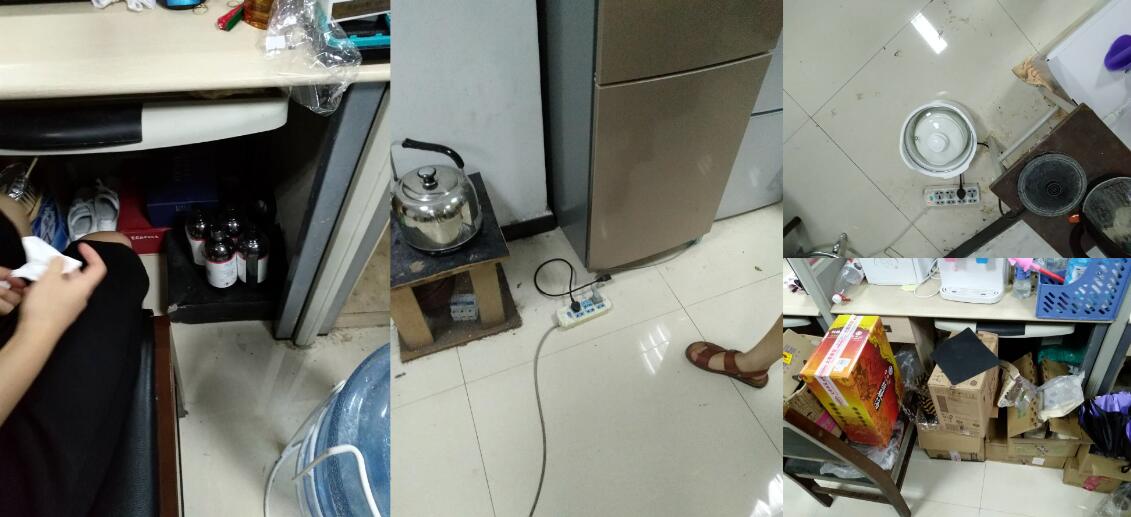在检查21教实验室过程中发现,员工自习室较混乱。部分员工在自习室煮食物,接线板置于地面,摆放与实验相关药品,存放大量易燃物和食品。