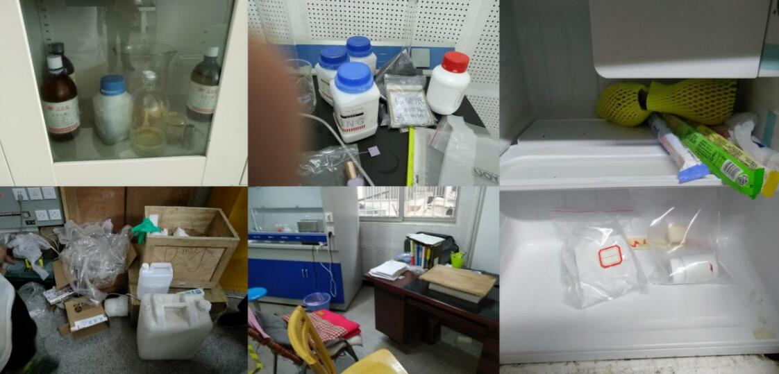 在检查25教实验室过程中发现,实验室药品摆放较随意,药品标识不明确,卫生清洁工作较差,部分实验室未实现学习和实验区域分离,实验区域内的冰箱摆放食物,电箱附近堆积大量易燃物。