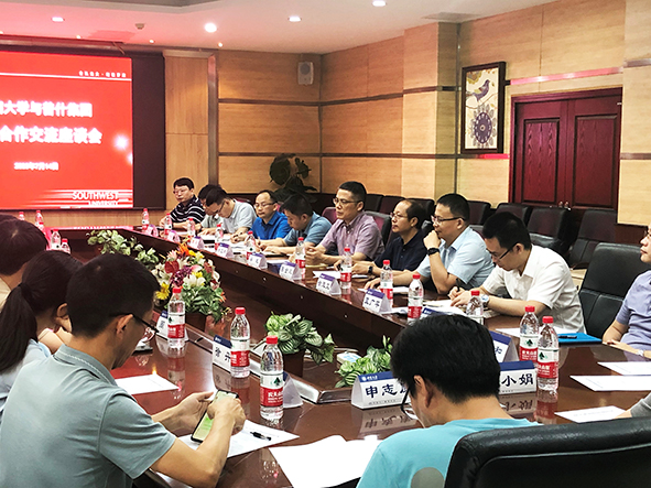 7月14日下午,五粮液下属单位普什集团副总经理闫庆禹一行五人在bevictor伟德宜宾研究院陈金凤经理陪同下到访公司,就bevictor伟德-普什集团校企合作展开参观和座谈交流。公司党委书记梁武、经理徐茂文和部分教师代表参加,此外,相关公司如蚕桑纺织与生物质科学公司、食品科学公司及工程技术公司部分教师代表一同参加了本次交流会。