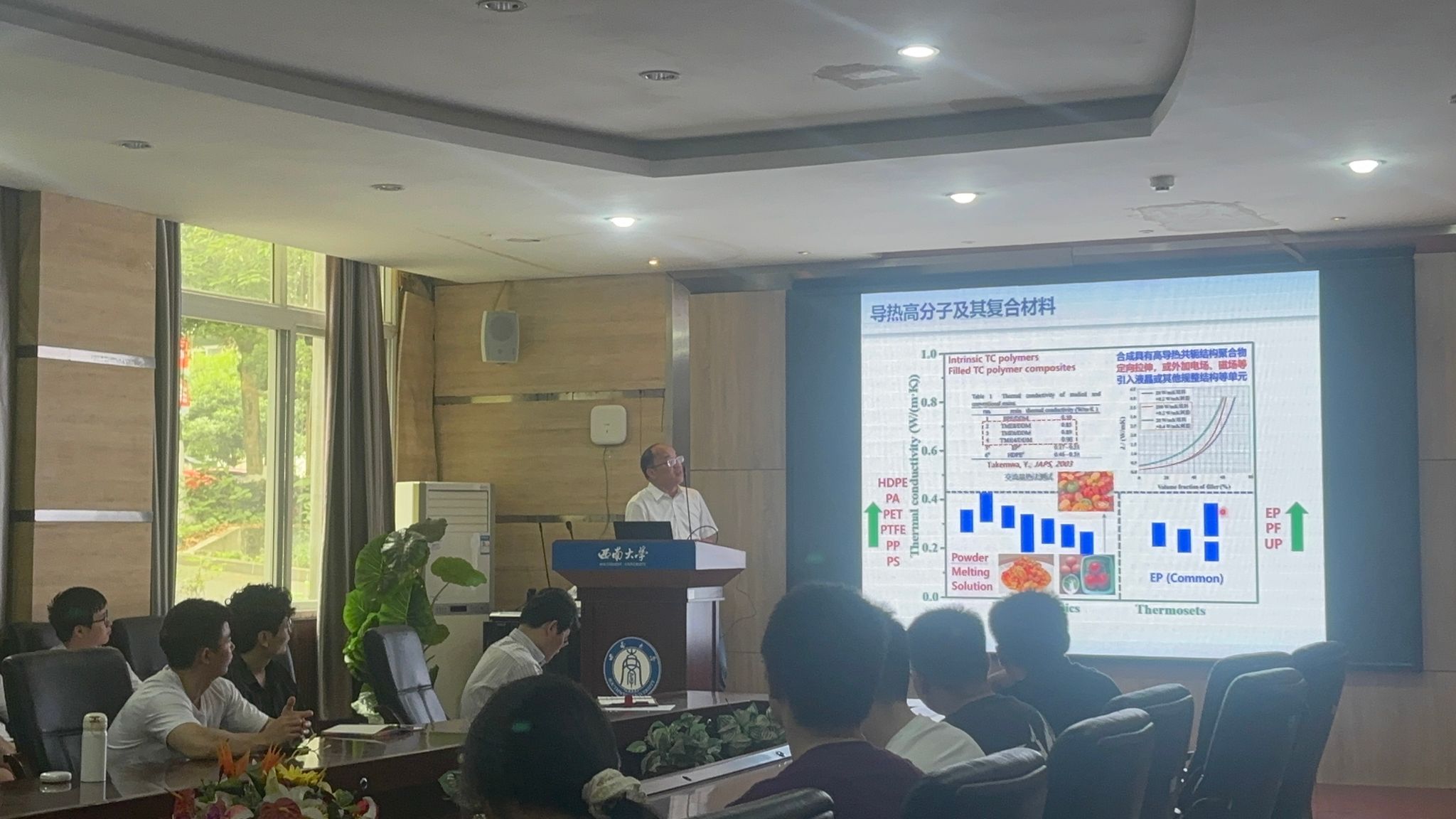 顾军渭教授作为国内材料科学领域的知名学者,围绕“结构/功能高分子复合材料(SFPC)在导热散热领域的研究进展”这一主题,为公司师生带来了一场精彩纷呈的学术报告。他指出,随着航空航天武器装备、特高压输电设备和5G通讯智能化控制系统等电子和电气技术的高速发展,日益突出的导散热问题已成为阻碍大功率电子元器件、超大规模和超高速集成电路,以及特高压输电设备乃至整个电子、电气产业发展的瓶颈问题。高分子材料虽然具有质轻、易成型加工、化学稳定性优良和成本低等显著优点,但其本体导热系数低,难以满足高功率化、高密度化和高集成化电子元器件以及特高压输电设备对高效快速导/散热的需求。针对这一挑战,顾教授详细介绍了其课题组在分子微观结构的有序设计、多尺度导热通路设计,导热填料-导热填料、导热填料-高分子基体界面优化调控,导热模型、导热经验方程构建及导热机理丰富等方面的研究进展。报告内容深入浅出,既有理论深度,又紧密结合实际应用,充分展现了高分子复合材料在导热散热领域的广阔前景与重要意义,引发了在场师生的热烈讨论与高度关注。