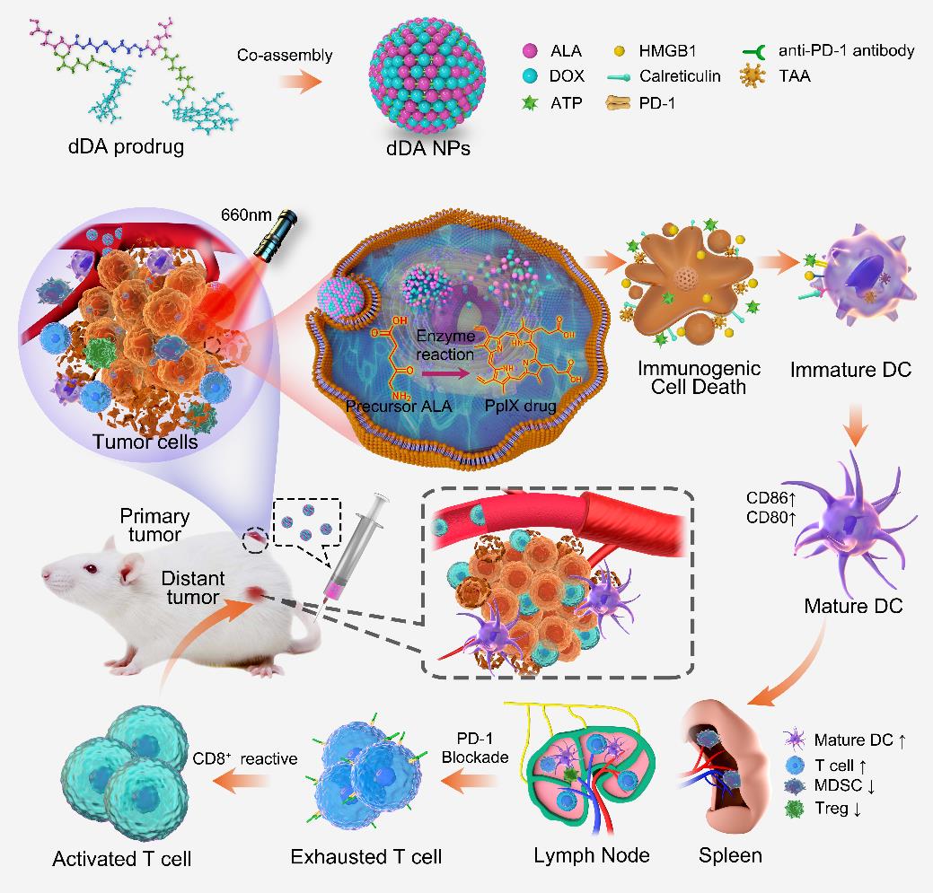 肿瘤免疫治疗在提高癌症治疗效果方面具有重要的潜力,然而患者响应率低和免疫相关毒副作用强是免疫治疗面临的重要挑战。基于纳米技术的肿瘤免疫治疗在调节免疫抑制的肿瘤微环境、减少不良副作用、激活肿瘤免疫等方面显示出巨大的潜力。最近,许志刚课题组合成了一类无赋形剂的谷胱甘肽/pH双响应的小分子前药纳米颗粒。该前药纳米颗粒兼具高载药率与药物可控释放等特点于一体,在体外和体内实验中表现出良好的光动力与化疗联合作用,有效诱导免疫原性细胞死亡(ICD)的死亡。进一步的双侧肿瘤模型实验显示,前药纳米颗粒表现出增强PD-1阻断免疫治疗效果,为肿瘤免疫治疗的发展提供了一类极具潜力的纳米免疫治疗新载体策略。