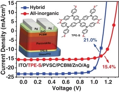设计、开发新型非掺杂空穴传输材料对于提高倒置(p-i-n)钙钛矿太阳能电池的效率、稳定性至关重要。本文报道了一种新型有机小分子TPE-S的合成及其作为空穴传输材料在钙钛矿电池中的应用。硫甲基的引入使得TPE-S几乎不被DMF溶解,且TPE-S薄膜对钙钛矿前驱液具有非常好的浸润性(TPE-S薄膜对DMF接触角仅有18º)。TPE-S与全无机钙钛矿(CsPbI2Br)匹配光电转换效率可达15.4 %,而与有机无机杂化钙钛矿匹配光电转换效率可达21.0 %,这项工作展示TPE-S作为简单且通用的无掺杂空穴传输材料的巨大潜力。
