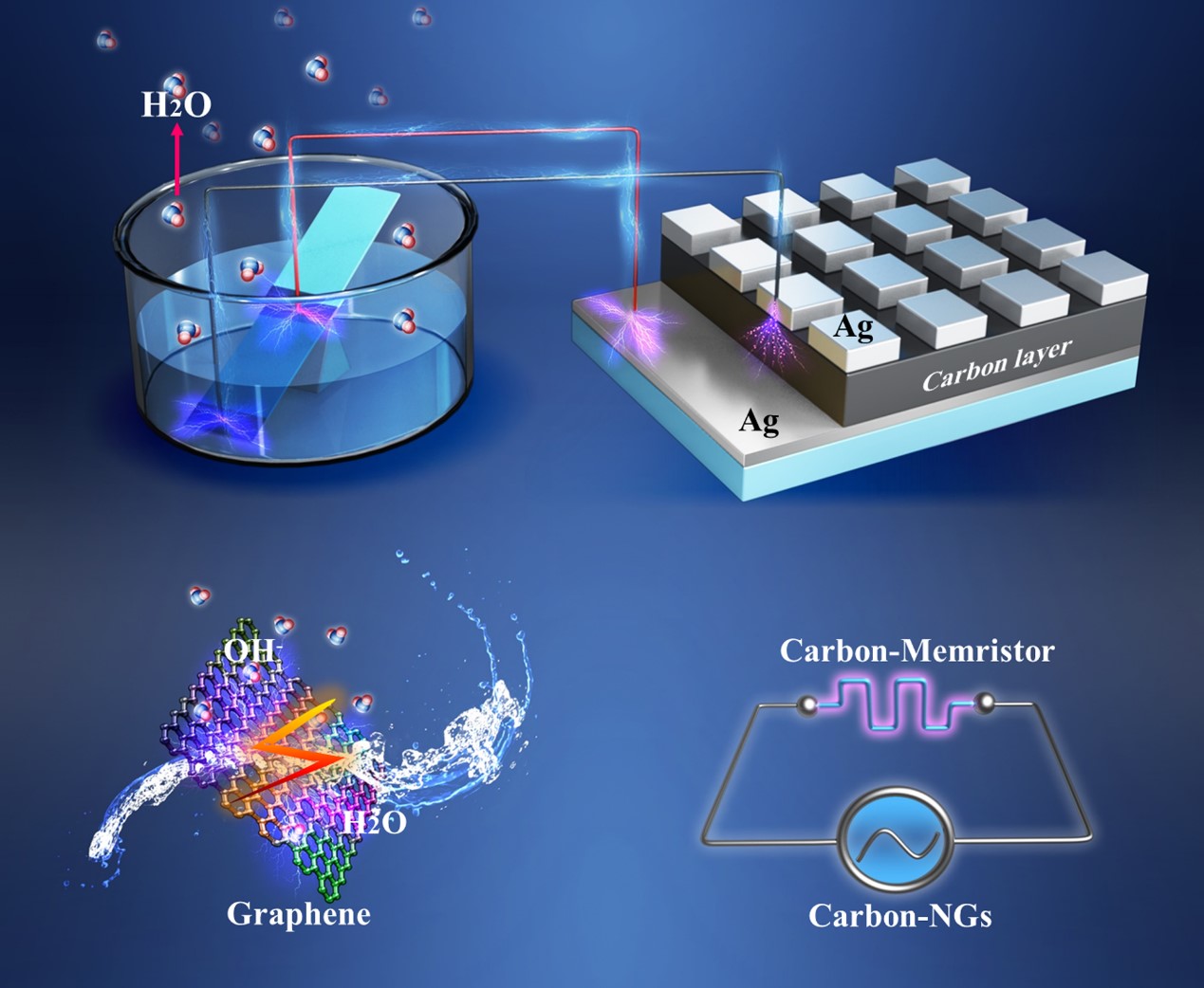 忆阻器作为一种无源器件,需要在外加电压扫描下才能工作。为解决这一问题,博士后周广东利用类石墨烯材料-炭黑,经过等离子处理之后插入去离子水中之后,观测到稳定电流和电压输出(水蒸气纳米发电机)。同时,利用这种类石墨烯材料制备的忆阻器阵列可观测到稳定的电子型忆阻现象。将制备的水蒸气