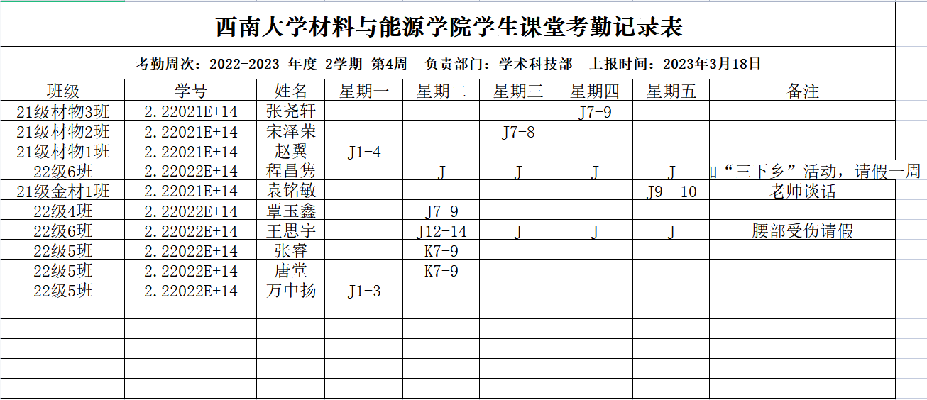 2022-2023年度第二学期伟德体育第四周考勤表